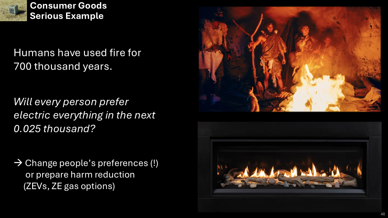The continued use of fire in some homes is inevitable. The policy choice is whether to support hydrogen blending and other early trials that will make it easier to move off fossil carbon-containing fuel sooner – or to unskilfully cling to the hope that after 700 thousand years everyone, even price-insensitive patricians, will neither want fireplaces nor flame stovetops, nor mobilize in perfervid opposition to mandatory electrification. Again, I think it’d be easier to ban beef.